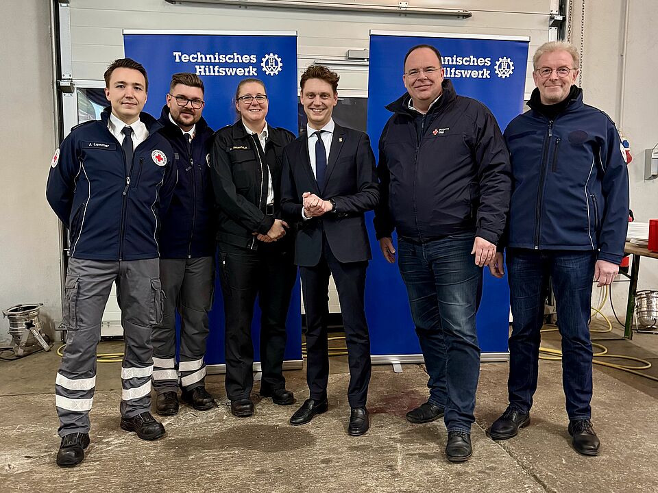 Das DRK zu Gast beim THW (v.l.n.r.): Justin Lummer, Rene Latta, Heike Neuenfeldt (Feuerwehr Solingen), Oberbürgermeister Daniel Flemm, Dr. Thorsten Böth, Rainer Muttschall. Bild: DRK SG