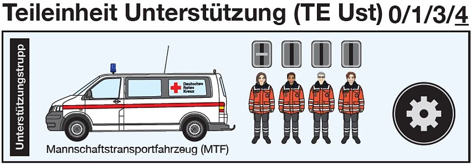 Die Teileinheit Unterstützung (TE Ust) unterstützt alle Teileinheiten der Einsatzeinheit NRW bedarfs- und lageabhängig. Weiter führt die TE Ust logistische Aufgaben wie Materialnachschub, Entsorgung und/oder Personaltransporte zwischen örtlich getrennten Einsatzabschnitten durch. Der Einsatz der TE Ust erfolgt in Abstimmung mit der Einheitsführung der Einsatzeinheit NRW.
